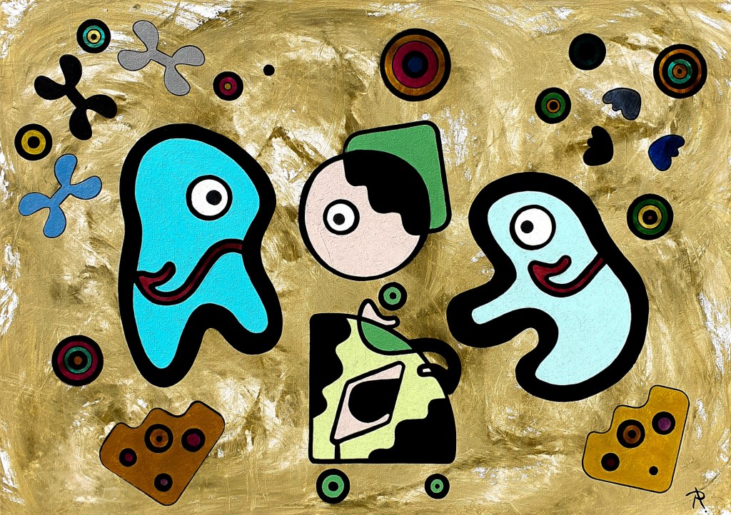 La toile évoque le mouvement, la route, la complicité et la persévérance. Les formes arrondies et joyeuses flottent sur un fond doré, comme des compagnons de voyage dans un univers imaginaire.
